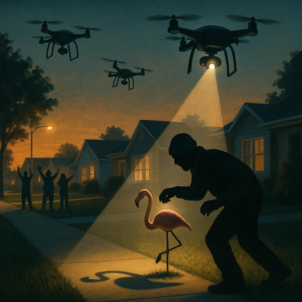 "Mulligan Patrol handles porch pirates, HOA nonsense, golf ball trespassin’. But if somebody rollin’ dirty with a duffel bag full of meth, them drones light ‘em up like Augusta in April and call the big guns.”
